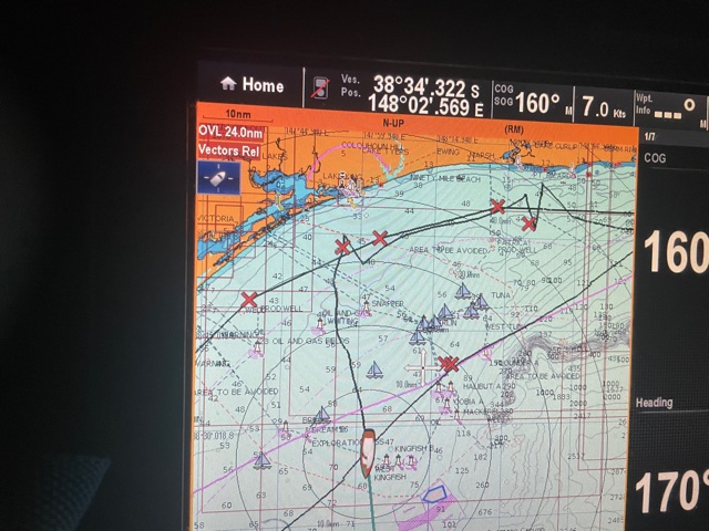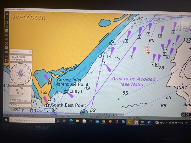 Our next goal is to round Wilson’s Promontory, aka South East Cape … around 80 miles away … or 13 hours at an average speed of 6 knots. So, if all goes to plan, mid-morning tomorrow, we will be around the Prom with our sights set on Westernport … Home. We then expect to berth at the marina at Hastings – travelling up the bay on the all-important incoming tide, by 8:00am Tuesday … less than two days away, 15 days out of Opua, Bay of Islands – cool!