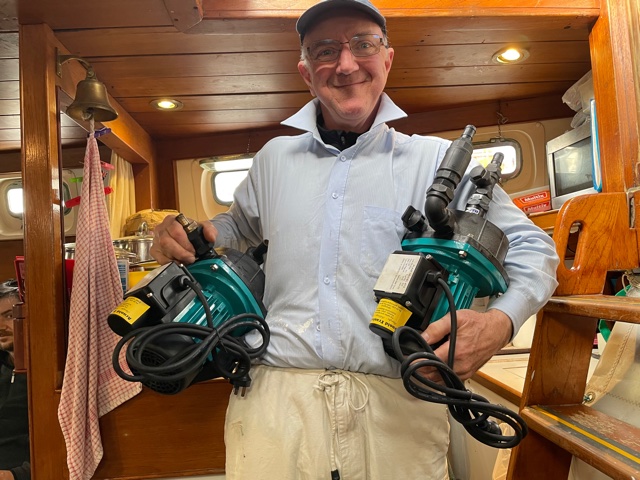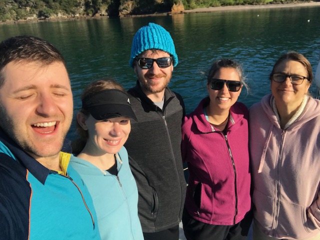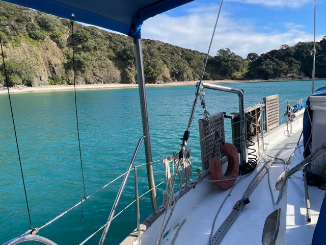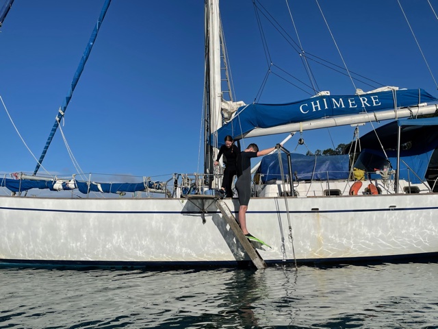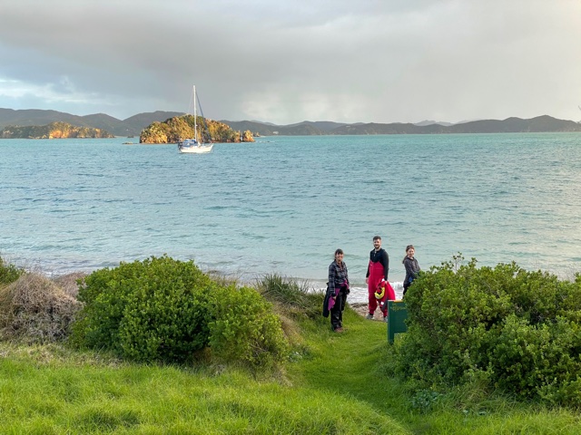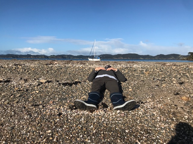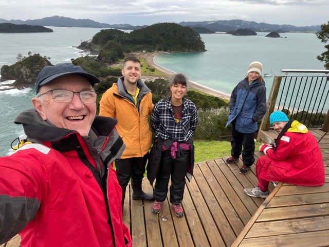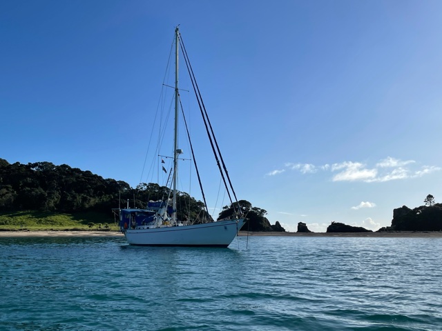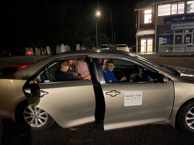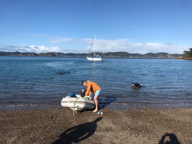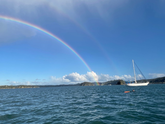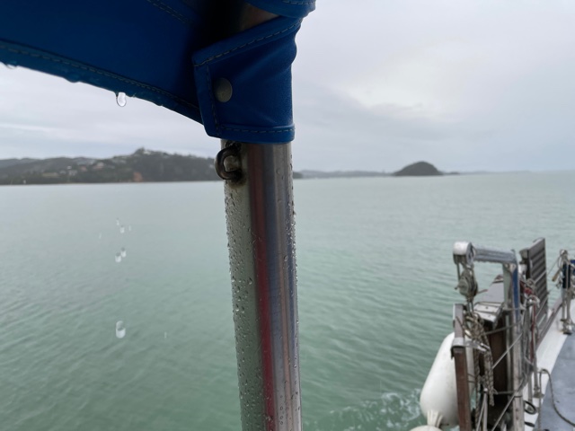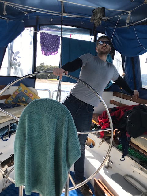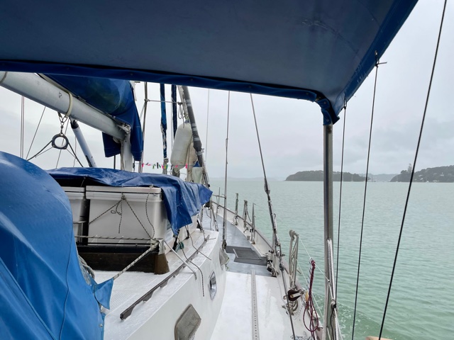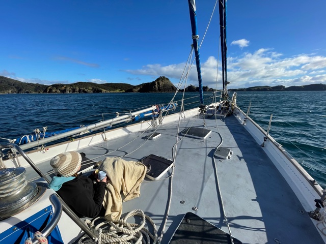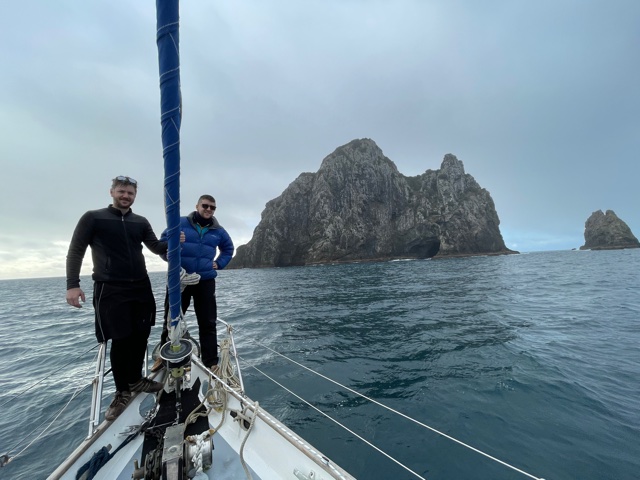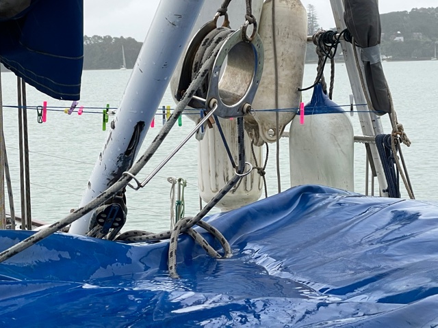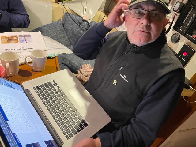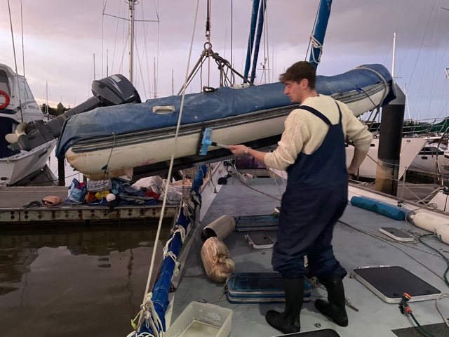 Work onboard now started to crank up a notch. Sam finished off his sewing on the cockpit seams and zips and then helped me to lift the big dinghy onto the foredeck. Matt continued to work on his weather-track modelling and all the while we anticipated the arrival of Harm from the Kerikeri airport – all the way from Melbourne.